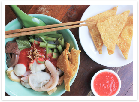 “Thai Street Food & Noodles” เป็นคำจำกัดความของร้าน ที่หมายถึงการที่เราเสิร์ฟทั้งเมนูประเภทข้าวและประเภทเส้นแบบไทยๆ ในสไตล์อร่อยง่ายๆ ในแบบที่ทุกคนคุ้นเคย ไม่ว่าจะเป็น ก๋วยจั๊บรสเยี่ยมสูตรโบราณกลมกล่อมทั้งน้ำข้นแบบไทยและน้ำใสแบบญวณ, ก๋วยเตี๋ยวต้มยำสุโขทัยไข่มะตูมอร่อยเข้มข้นแบบไม่ต้องปรุง, เย็นตาโฟรสแซ่บ ใส่เครื่องมาแบบแน่นชาม, ข้าวซอยน่องไก่น้ำขลุกขลิก อีกทั้งยังมีสาระพัดเมนูข้าวและขนมจีน ที่การันตีความอร่อย พร้อมเมนูขนมหวานและเครื่องดื่มที่ทุกคนชื่นชอบ ทั้งเฉาก๊วยนมสด, สละลอยแก้ว, น้ำสมุนไพรแสนชื่นใจ ฯลฯ
